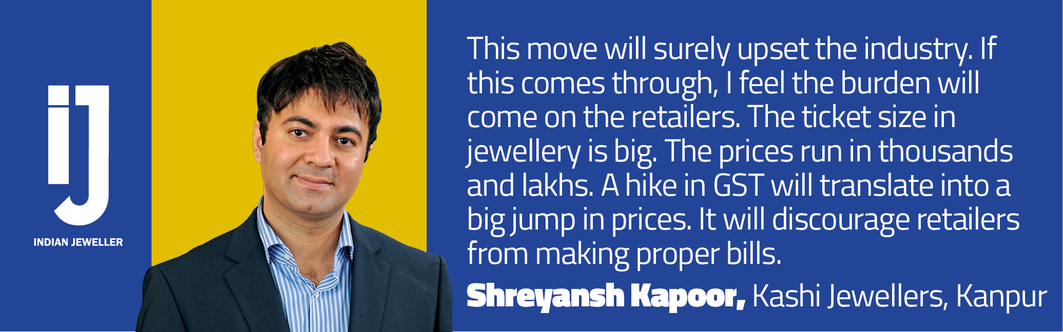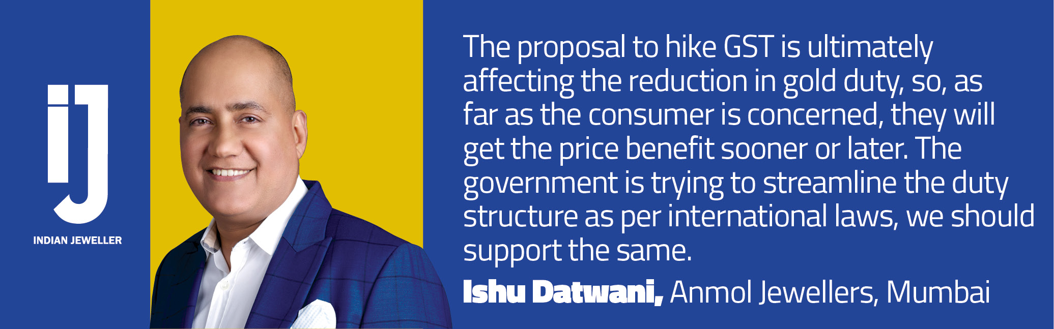 Striking a different note, Ishu Datwani, Anmol Jewellers, Mumbai, says, “There are, and will always will be, people who want to save on GST, even if it is 3%. But for organized players like Anmol Jewellers, succumbing to pressure is not something we do. We believe in abiding by the law. The proposal to hike GST is ultimately affecting the reduction in gold duty, so, as far as the consumer is concerned, they will get the price benefit sooner or later as the rate/tax paid by the consumer will be compensated with the reduced gold rate in the future. The government is trying to streamline the duty structure as per international laws, and as an industry, we should support the same.”