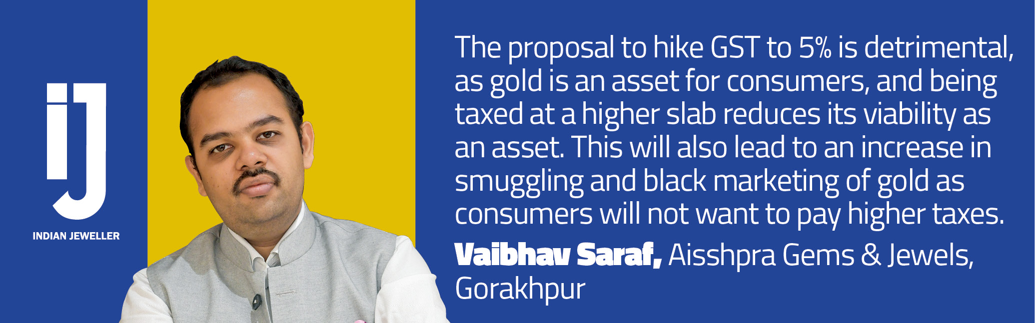 Explains Vaibhav Saraf, Aisshpra Gems & Jewels, Gorakhpur, “The proposal to hike GST to 5% is detrimental, as gold is an asset for consumers, and being taxed at a higher slab reduces its viability as an asset. This will also lead to an increase in the black marketing of gold as consumers will not want to pay higher taxes. This will result in increased smuggling of gold too. The current gold prices are lower in the short term, in the long term, the value of the yellow metal always increases, and, therefore, a hike in GST while prices are low doesn’t cushion the impact in any substantial way.”