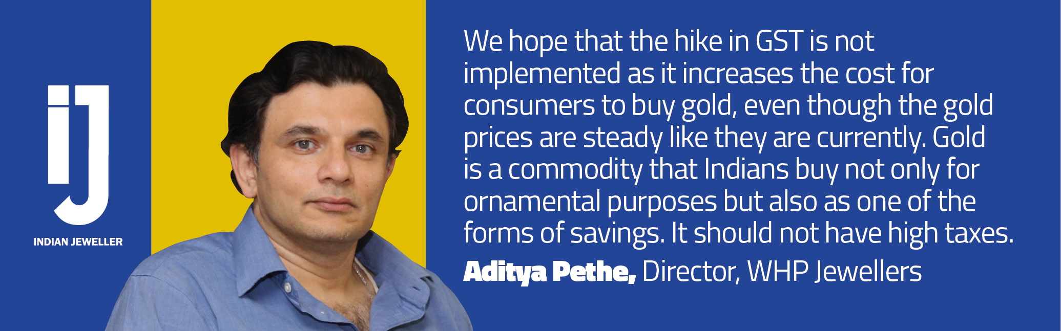 Agrees Aditya Pethe, WHP Jewellers, “We hope that the hike in GST is not implemented as it increases the cost for consumers to buy gold, even though the gold prices are steady like they are currently. Gold is a commodity that Indians buy not only for ornamental purposes but also as one of the forms of savings and building assets, and it should not have high taxes. Even a simple housewife who doesn’t understand other means of investment saves in the form of gold.
