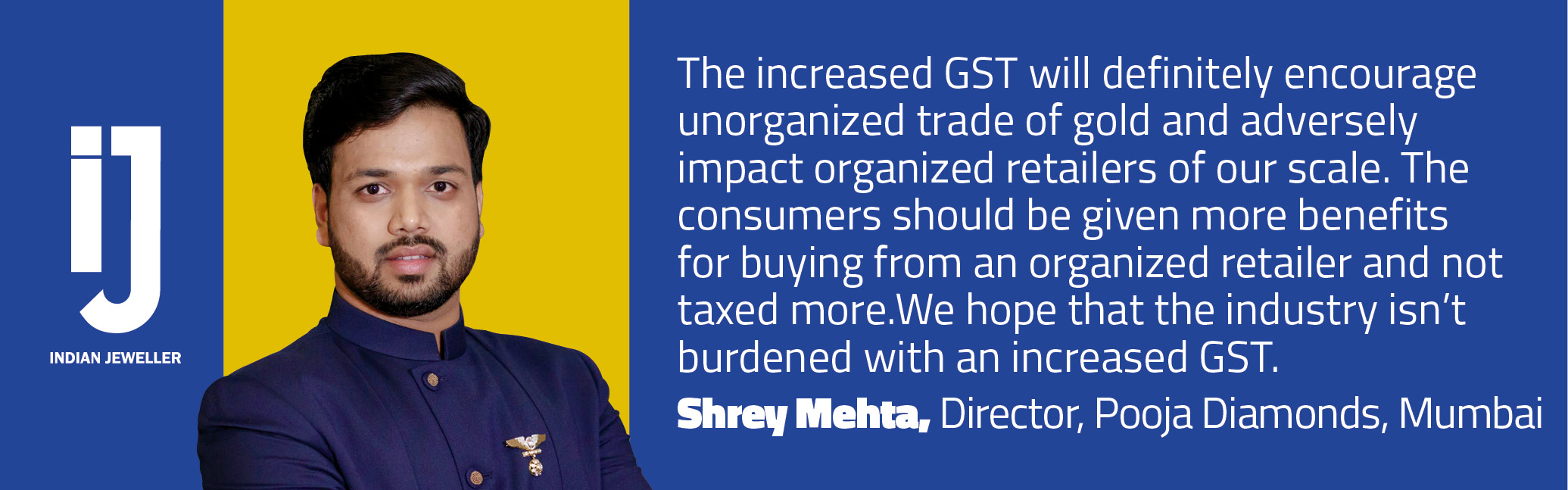 Adds Shrey Mehta, Pooja Diamonds, Mumbai, “The increased GST will definitely encourage unorganized trade of gold and adversely impact organized retailers of our scale. Organized retailers like us follow every government norm and support every new policy by implementing it. The consumers should be given more benefits for buying from an organized retailer and not taxed more. The jewellery industry is anyways undergoing a lot of transformations with policies like HUID, and we hope that it isn’t burdened with an increased GST as well.”