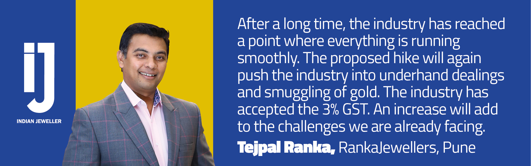 Retailers are particularly miffed about the timing of the proposed move. Says Tejpal Ranka, Ranka Jewellers, Pune, “After a long time, the industry has reached a point where everything is running smoothly. Everything is happening in a clean manner. The proposed hike will upset the apple cart. It will again push the industry into underhand dealings and smuggling of gold. The industry has accepted the 3% GST. An increase will add to the challenges we are already facing in view of high prices, COVID, etc. This is most unfortunate.”