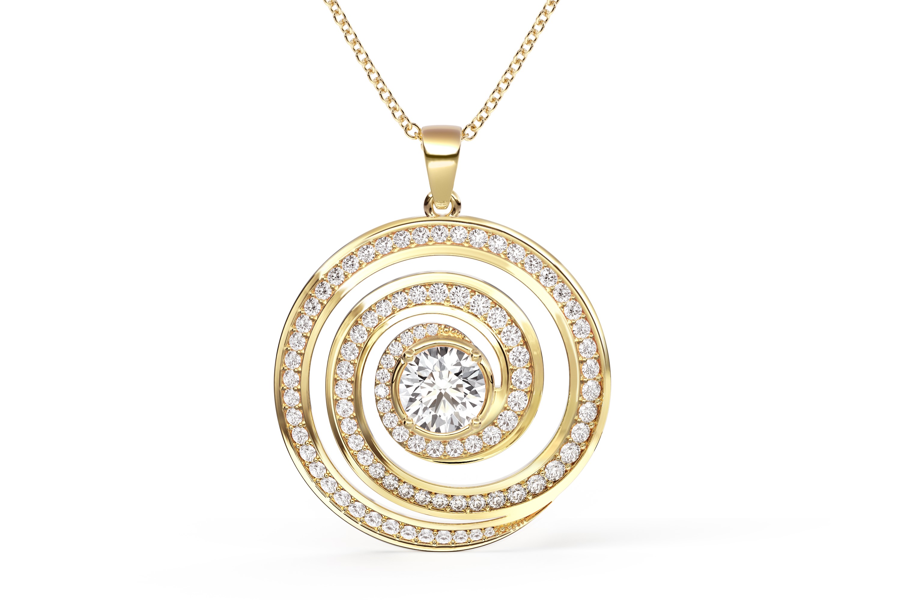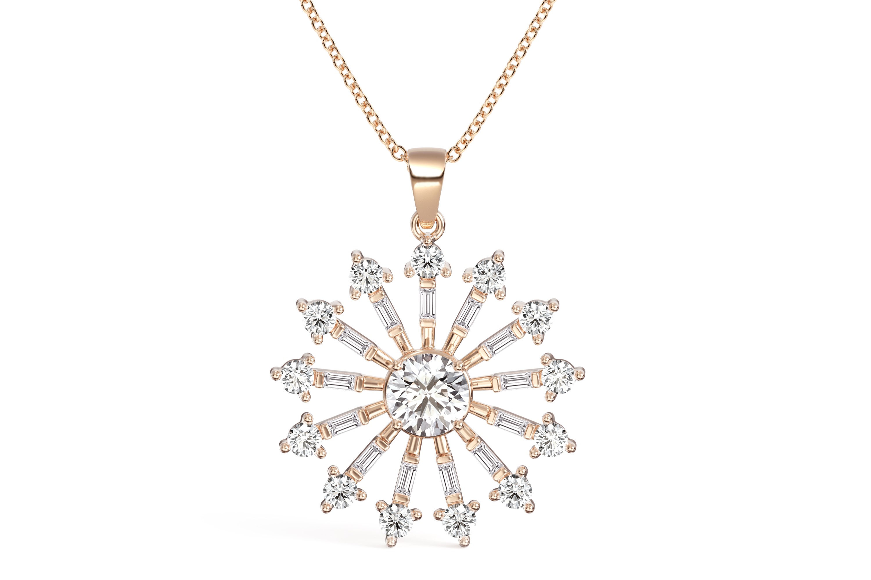 The Inner Radiance pendant is structured around a centre diamond with additional stones arranged in a circular format. Journey to Self is designed as a spiral form with a central diamond and is offered across three gold variants. Light Catcher features a centre diamond within an open-circle frame, supported by a halo of stones, and is also available in three metal options. Compass of Light incorporates a star-shaped layout in rose gold with a central natural diamond and a surrounding halo.