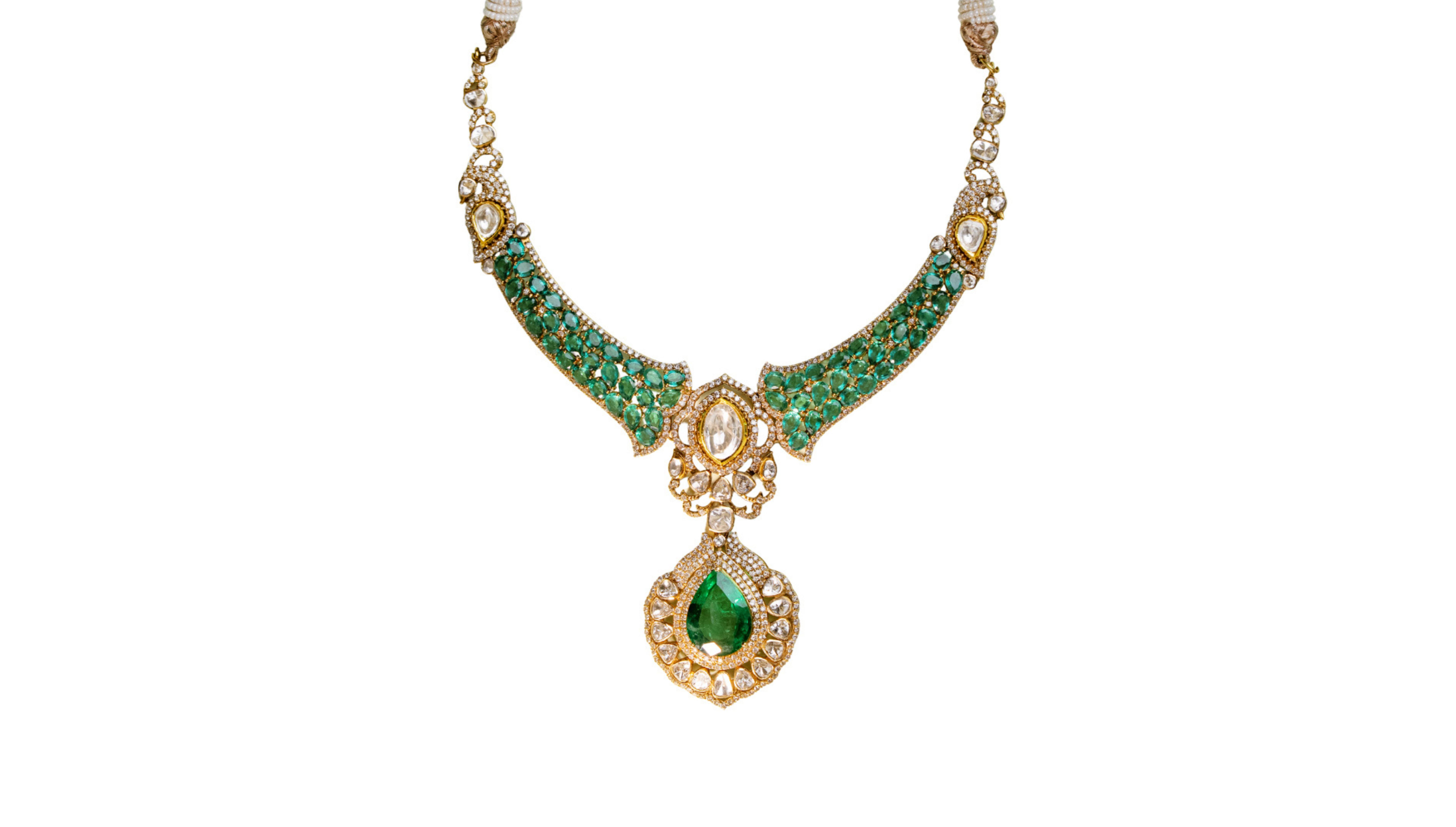 An emerald statement necklace featuring layered emeralds and polki elements, drawing from classic royal jewellery design language.