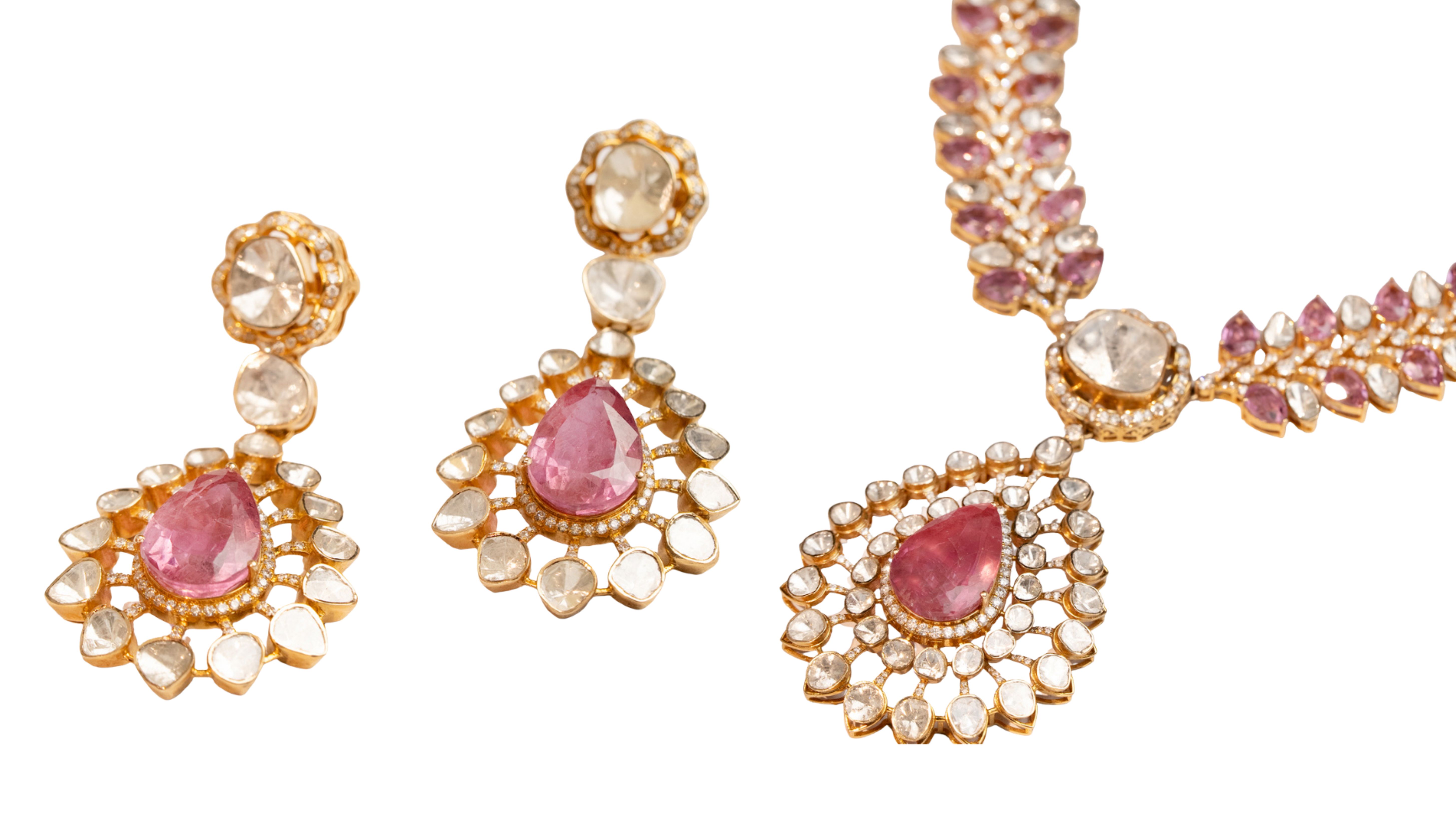 A pink polki set combining rose-toned stones with uncut diamonds, positioned as an option for evening wear and celebratory events.