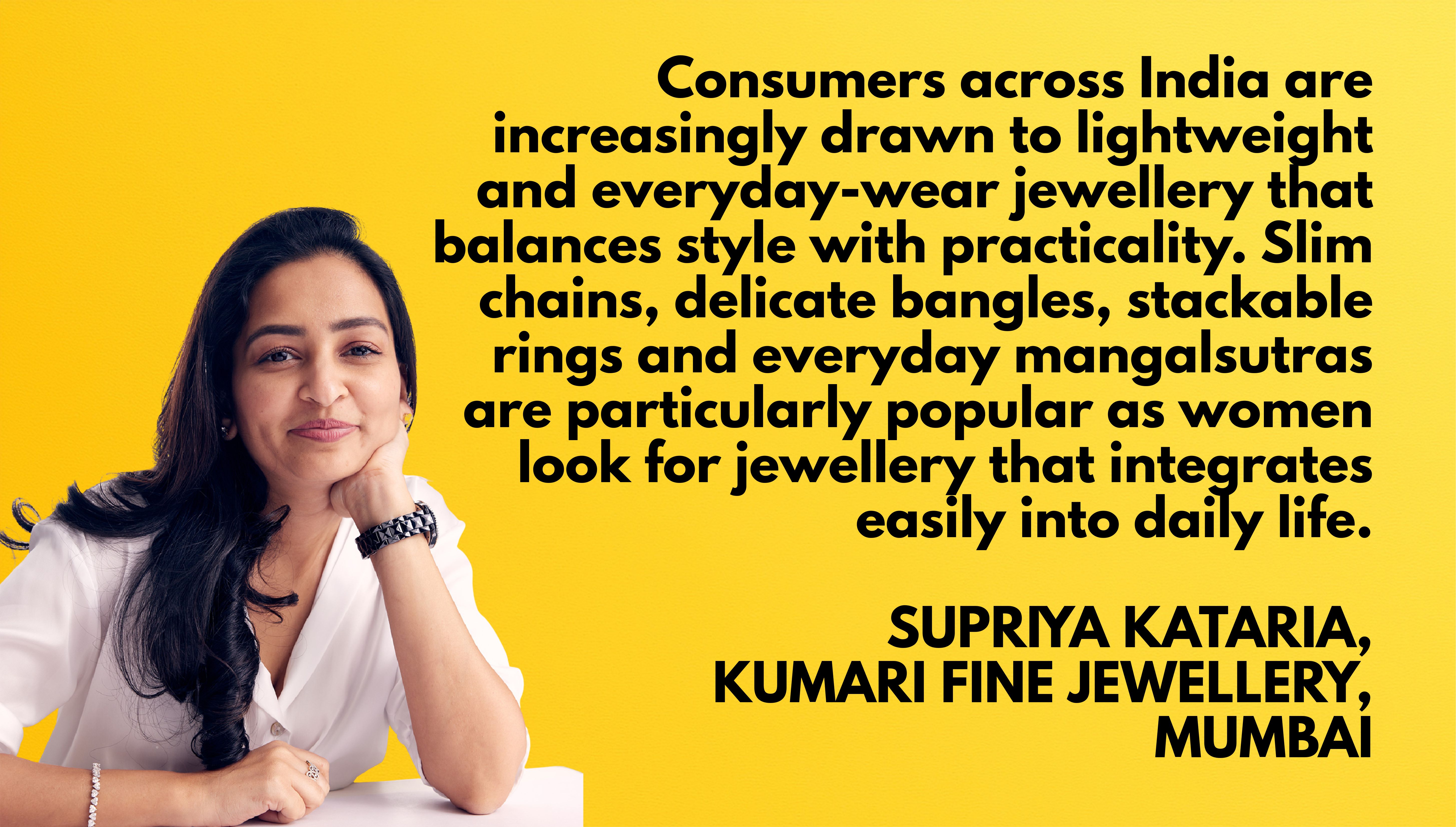 Supriya Kataria, Kumari Fine Jewellery, Mumbai, says consumers are seeking jewellery that fits naturally into their daily routines. “Female consumers across India are increasingly drawn to lightweight and everyday-wear jewellery that balances style with practicality. Slim chains, delicate bangles, stackable rings and everyday mangalsutras are particularly popular, as women look for jewellery that integrates easily into daily life.”