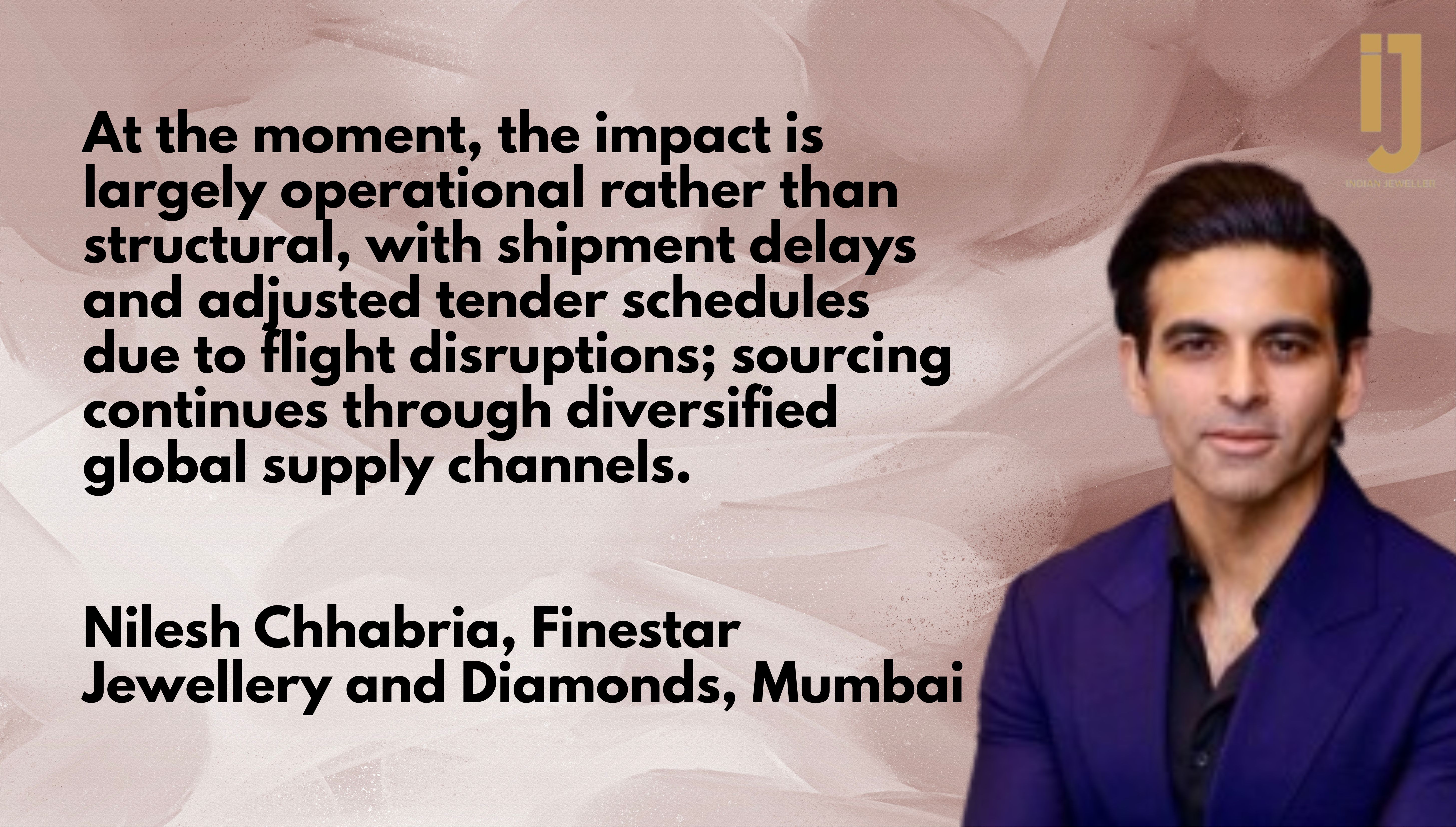 Mumbai-based Nilesh Chhabria of Finestar Jewellery and Diamonds says, “At the moment, the impact is largely operational rather than structural, with shipment delays and adjusted tender schedules due to flight disruptions; sourcing continues through diversified global supply channels.”