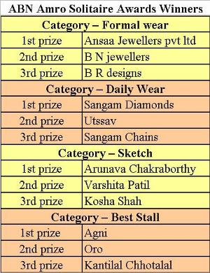 {{Solitaire Award Night :}}%% The star studded evenings brimming with glitz and glamour were incomplete without the {{ABN Amro Solitaire Design Awards.}} The eagerly awaited awards were announced on 8th August 2009 at Renaissance hotel, Mumbai. {{Victor van der Kwast,}} CEO of the International Diamond & Jewellery Group, ABN Amro Bank was the chief guest. The theme of the awards was global celebrating festivities across the country. %% An enthralling dance performance and mesmerizing jugal bandi by noted drummer {{Shivamani }}with {{Sitarist Ravi Chari}} and world noted clarinettist Woody set the ball rolling for a memorable night. While citing that the awards have inspired the precious industry to bring out their creativity in the form of intricate and beautiful jewellery, Vasant Mehta, Chairman, Gems and Jewellery Export Promotion Council congratulated those who reached the finals. Talking about ABN Amro’s relationship with the Indian gems and jewellery industry, Kwast said that ABN Amro is a diamond bank and wishes to remain a diamond bank. IIJS Convenor {{Navin Jashnani}} said, “Every year there are new companies bringing out new ideas and winning the awards.” The event ended with models wearing the winning designs and walking the ramp. %%On bagging the first prize for the best stall {{Sudesh Shoor}} and {{Dinesh Shoor}}, Directors of Agni, said “Winning the award is indeed a pleasant surprise.”%% An exuberant {{Anand Shah}} eight time winner of Ansaa Jewellers said , “Every year we try something innovative for the industry. This year we came with oil painted jewellery. What and where we are is because of the recognition that IIJS has bestowed on us. We thank IIJS and Solitaire for great recognition. It is really a nice platform for jewellery.” %%