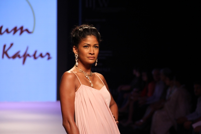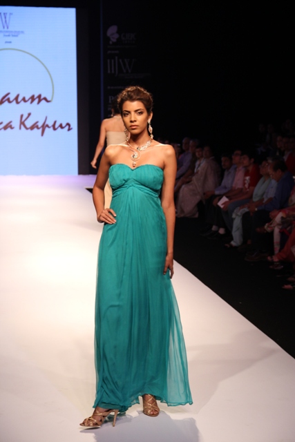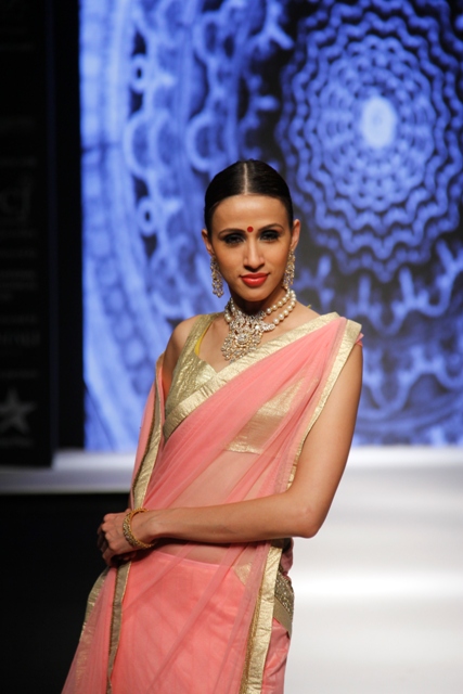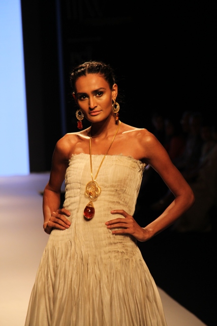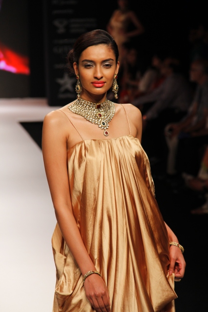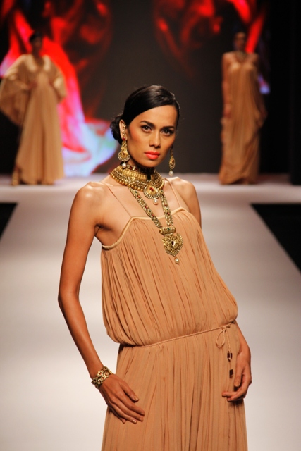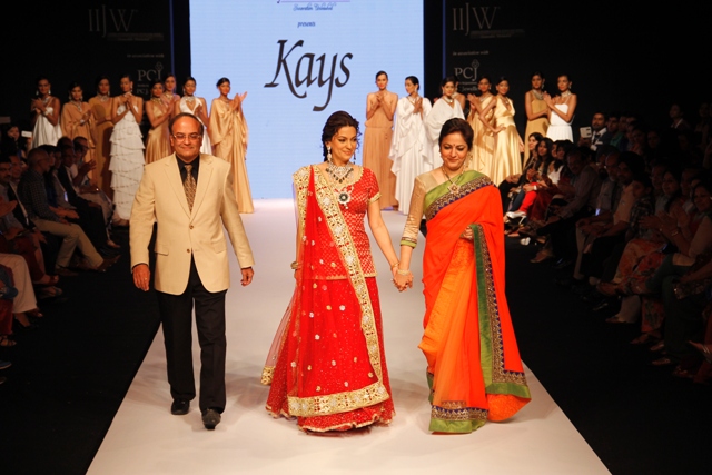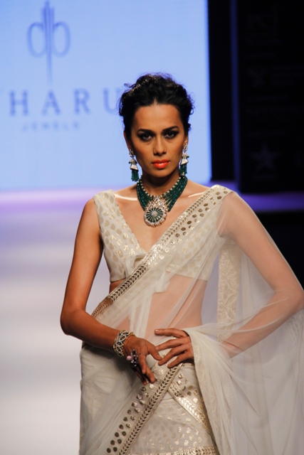 Zeenat Aman, was a fitting showstopper to the collection when she walked down the catwalk wearing some of the most stunning pieces from the R K Jewellers. The stupendous Raani Haar with encrusted dual pendants, shoulder dusters, bangles and ring were creations indeed fit for a super Bollywood star.
